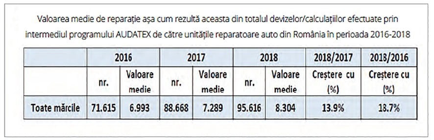 De altfel, valoarea medie de reparație, așa cum rezultă aceasta din totalul devizelor/calculațiilor efectuate prin intermediul programului AUDATEX de către unitățile reparatoare auto din România, în perioada 2016 – 2018, a crescut cu 18,7% în intervalul amintit.