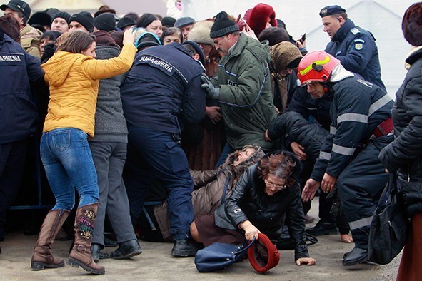 În exteriorul catedralei, mii de oameni veniți din toată țara și-au așteptat rândul pentru a vizita altarul, motiv pentru care jandarmeria a dislocat trupe importante menite să asigure accesul organizat la altar. Pe fondul oboselii și al temperaturii scăzute, unii și-au pierdut răbdarea și au forțat bariera de jandarmi. Tot în timpul slujbei de sfințire, un preot din Constanța, nemulțumit de faptul că a fost caterisit după ce a comis un accident rutier, s-a autoincendiat.