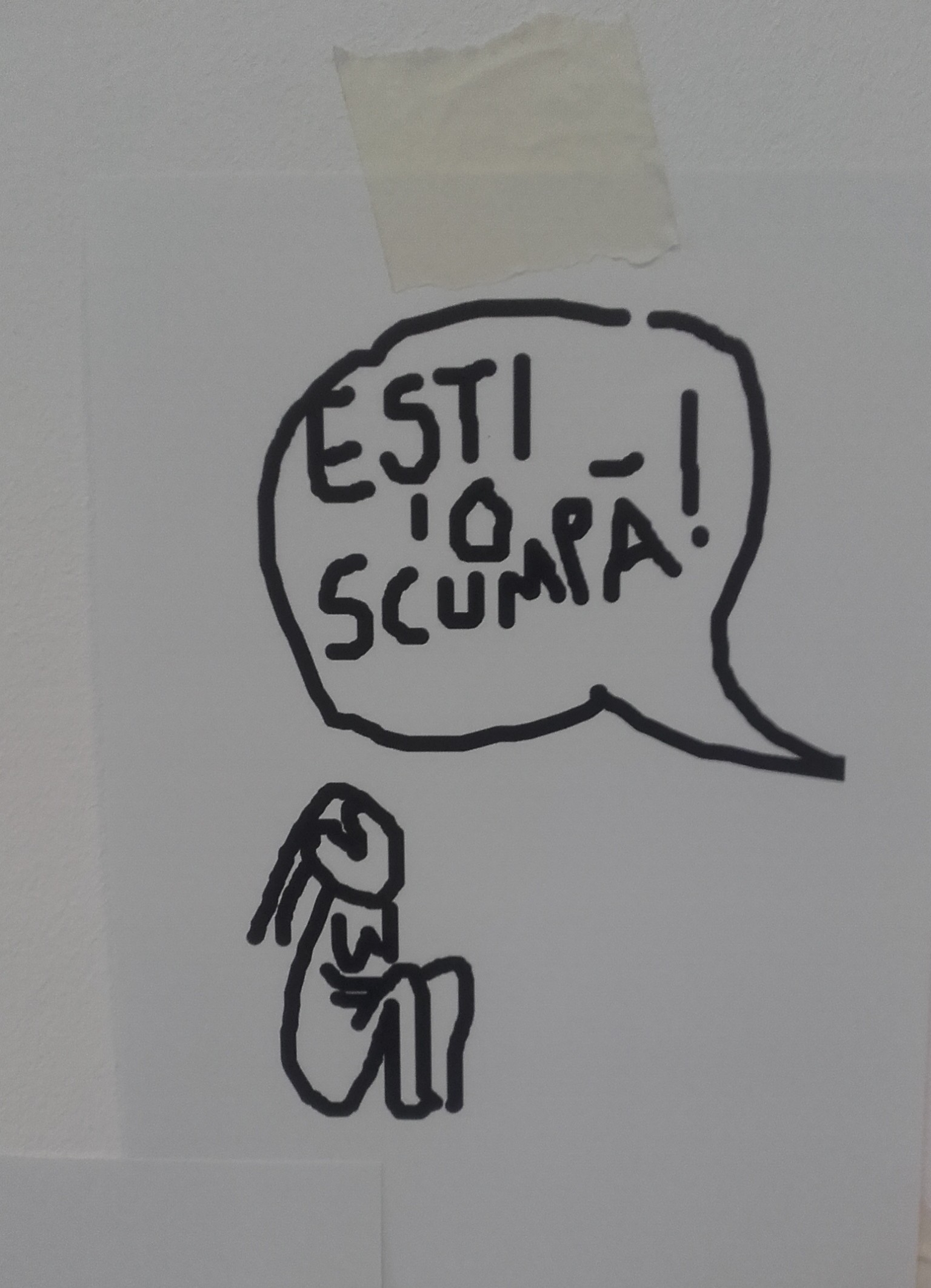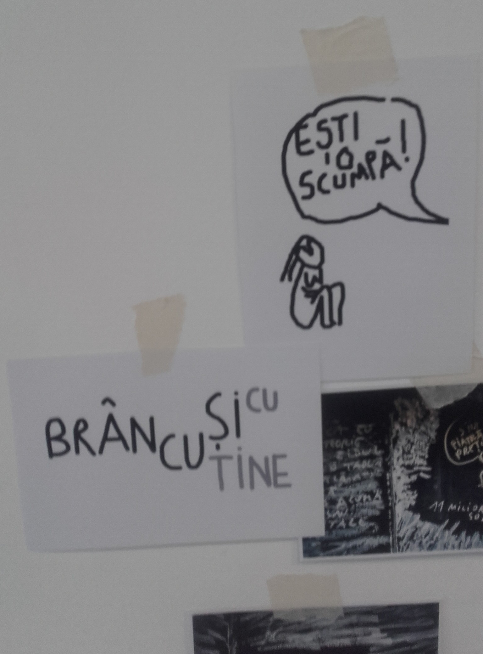 O expoziție de idee, așadar; sau, privind către obiectele și imaginile din sală, un soi de instalație; sau – ziceam – o „acțiune”, un (sau tot „o”!) „happening” artistic. În mijloc – vitrina care a protejat Cumințenia… cu ocazia prezentărilor ei publice din ultimii ani, purtând acum teancul de bancnote, paralelipipedul de sticlă nemaifiind așezat pe un postament, ci pe cele două volume ale unei istorii a artei plastice românești, la vedere fiind lăsată, pe coperta secundă, Domnișoara Pogany, deci jos, aproape de podea, încât „recuperatorii” să se poată apleca spre a extrage suma pe care au donat-o în 2016. „Veniți și luați cât ați pus. 50, 10 sau 1 leu. Dacă nu vă aduceți aminte, aproximați cu gentilețe. Cu câteva excepții, nu știu cine și cât a donat. Nu am cum verifica. Mergem pe încredere”, a notat Perjovschi, cu – iată! – „gentilețe”, în textul însoțitor al „acțiunii”. În lateral dreapta, lipite pe perete – o declarație despre cei 1.514 lei strânși din donații și factura de depunere a sumei la bancă. Iar pe masa din fundal și pe verticala de acolo – imagini, fotografii, tăieturi de presă la temă și desene ale lui Dan Perjovschi despre și cu sculptura căreia i se spune din afara cadrului, într-o „bulă” de dialog, cu dublu sens, în maniera isteață-amuzantă-corozivă a lui Perjo: „EȘTI O SCUMPĂ!”.