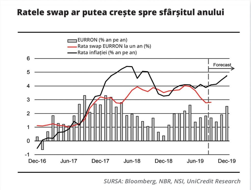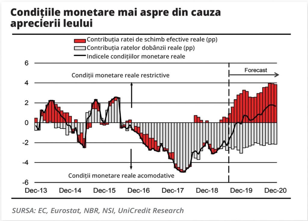 Condițiile monetare reale s-au înăsprit în 2019, deși într-un un amestec greșit,” consideră analiștii economici ai Unicredit Bank. „Leul s-a apreciat în termeni reali în timp ce ratele dobânzilor ROBOR au fost autorizate să scadă sub 3% prin menținerea excesului de lichiditate în sistemul bancar. BNR este puțin probabil să crească ratele de politică, deși ar trebui să reacționeze la a doua rundă efectele creșterii prețurilor la energie și gaze. Politica monetară relaxată din Europa și SUA, inflația importată scăzută și scăderea presiunii cererii interne asupra prețurilor sunt motive pentru ca BNR să păstreze în continuare același nivel de dobândă. Ca urmare, împrumuturile consumatorilor și companiilor în lei și euro au accelerat,” arată analiștii Unicredit. Împrumutul acordat companiilor este foarte bun din perspectiva investițiilor, dar riscurile valutare sunt în creștere pe măsură ce împrumuturile în euro ar depăși împrumuturile în lei. Acest lucru se poate dovedi relevant mai ales dacă avem o creștere a cursului de schimb leu-euro în trimestrul IV din 2019 și s-ar depăși nivelul de 4,80. De altfel, pentru sfârșitul acestui an majoritatea analiștilor economici văd un curs de la 4,80 lei pentru un euro, care ar putea urca chiar la 4,90 lei pentru un euro în primul trimestru din 2020. „Leul rămâne una dintre cele mai supraevaluate valute din Europa Centrală și de Est și această depreciere pas cu pas nu va elimina supraevaluarea. BNR poate decide să-și folosească rezervele pentru a apăra moneda anul viitor, dacă apetitul pentru activele țărilor emergente scade. Intrările de fonduri ale UE rămân modeste din cauza faptului că, sumele pentru cofinanțare sunt „aglomerate” de alte tipuri de cheltuieli bugetare. Ne așteptăm ca deficitul de cont curent să crească în acest an și să rămână la peste 4% din PIB în 2020,” .