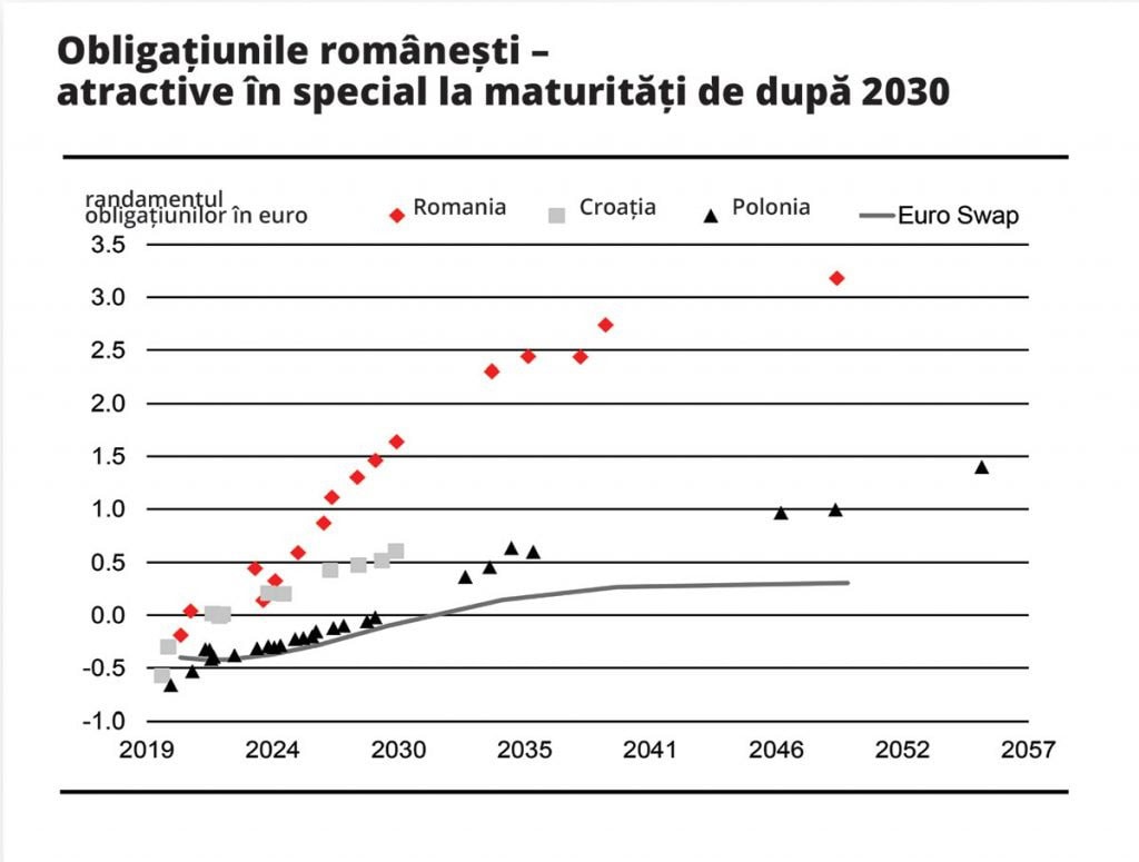 În aceste condiții obligațiunile românești în euro ar putea fi singurele titluri de nivel investițional în UE cu randamente pozitive sub 10ani, până la sfârșitul anului. Prețul lor a ajuns deja comparabil cu cele din categoria „junk-bondurilor” în comparație cu colegii regionali. Mai mult, curba randamentelor este foarte abruptă și oferă o valoare bună la scadențele de după 2030. ■