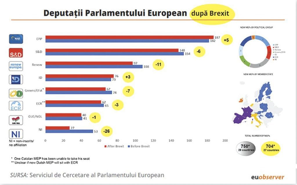 Conform unei proiecții neoficiale a instituțiilor uniunii, componența Parlamentului European se va înclina spre dreapta, deoarece Partidul Popular European de centru-dreapta și partidul Identitate și Democrație, de extremă dreaptă, au câștigat cele mai multe locuri post-Brexit. Socialiștii și democrații (S&D), Renew Europe și verzii pierd în total 24 de locuri.