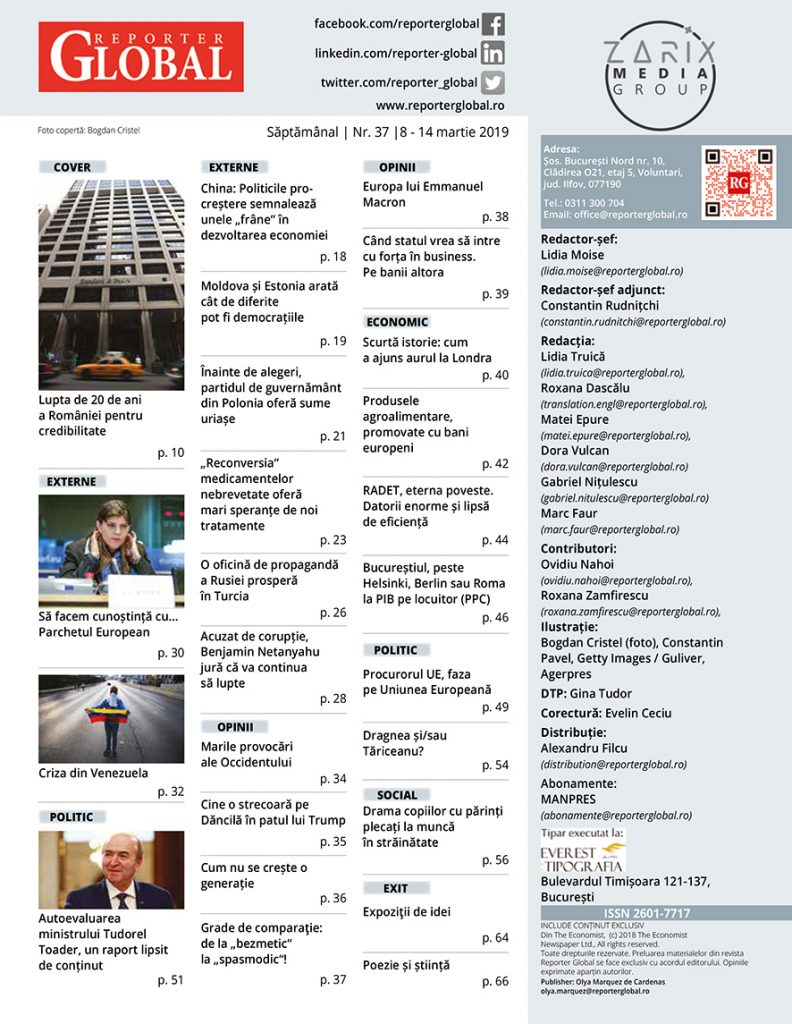 Reporter Global, săptămânal economic, partener exclusiv The Economist vă oferă, începând cu 8 martie numărul 37 al revistei. În cele 66 de pagini ale ediției veți găsi interviuri și analize interne și internaționale, din domeniile economic și politic, opinii și editoriale scrise de jurnaliștii noștri și de contributori de marcă.