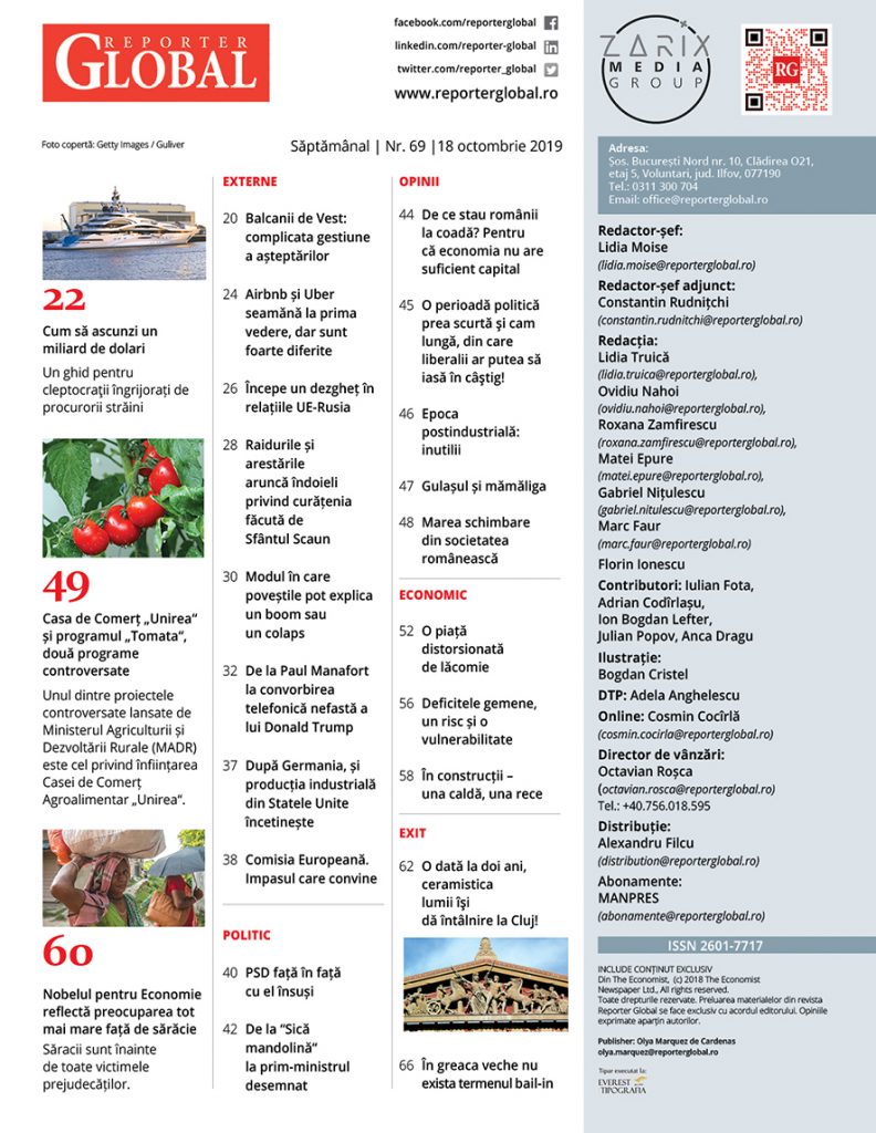 Reporter Global, săptămânal economic, partener exclusiv The Economist, vă oferă începând cu 18 octombrie numărul 69 al revistei. În cele 66 de pagini ale ediției veți găsi interviuri și analize interne și internaționale din domeniile economic și politic, opinii și editoriale scrise de jurnaliștii și contributorii noștri de marcă.