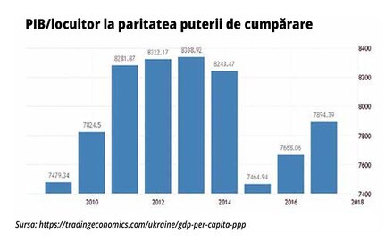 Din 2016, economia ucraineană arată semne de stabilizare, după ani de tensiuni politice și economice. Conform FMI, în 2018 țara vecină a înregistrat o creștere a PIB de 3,5%, determinată de cererea internă, în condițiile în care consumul gospodăriilor populației reprezintă aproape 70% din PIB. Totuși, ritmul de creștere a economiei este de așteptat să se reducă, având în vedere constrângerile de politică monetară, care ar trebui aplicate, precum și rambursările semnificative ale datoriilor publice, care vor diminua cheltuielile publice. Estimările pentru 2019 și respectiv 2020 indică rate de creștere de 2,7% și de, respectiv, 3%. În valoare nominală, PIB-ul Ucrainei a fost de 112,13 miliarde de dolari în 2017 și de 126,39 miliarde de dolari (estimare) în 2018, ceea ce, raportat la populație, se traduce într-un PIB/locuitor la paritatea puterii de cumpărare de 2.656 de dolari în 2017 și 2.964 de dolari în 2018 (circa 7.900 de dolari la paritatea puterii de cumpărare).
